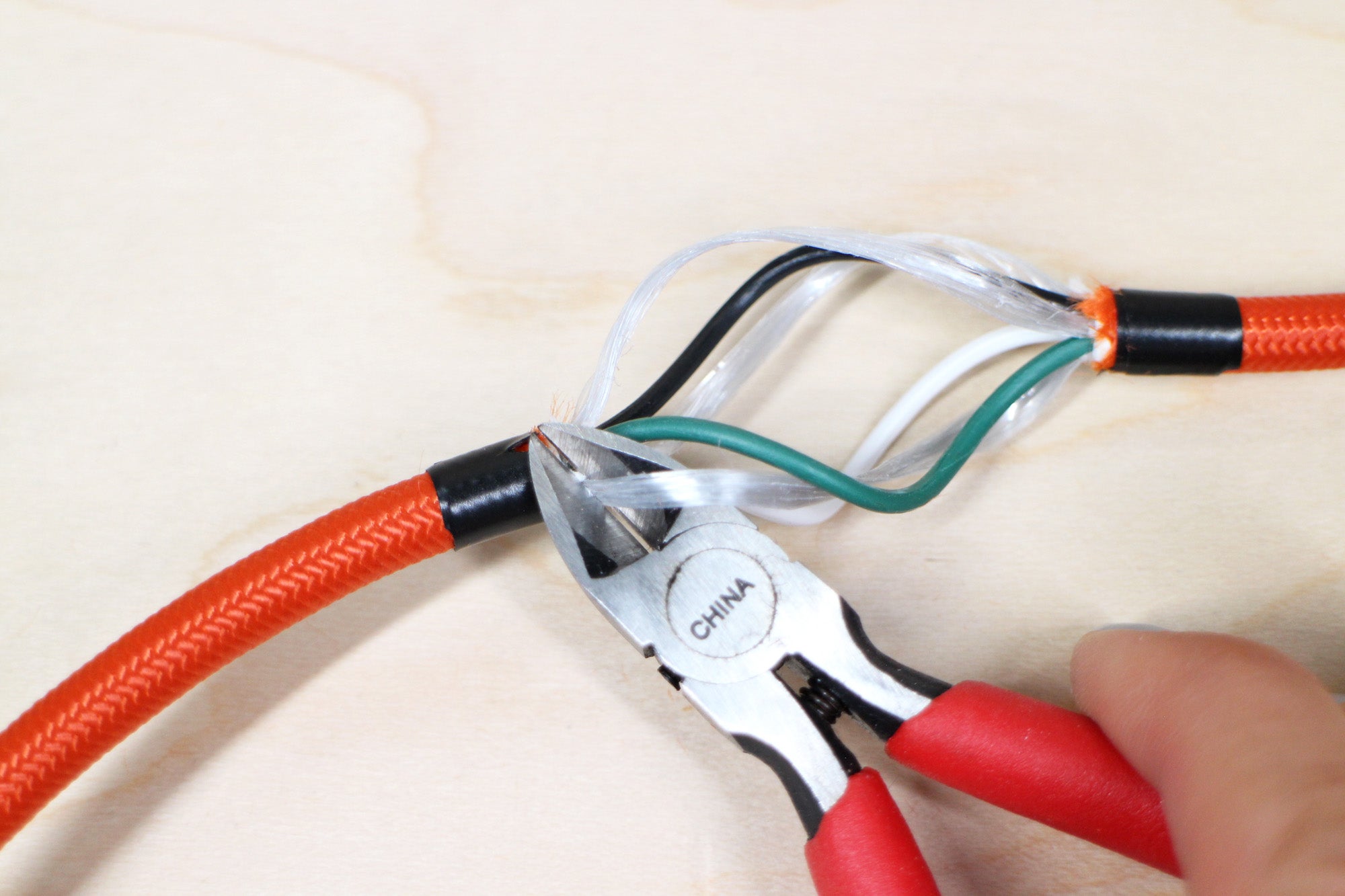 Using the wire cutters, at the halfway point between the socket and plug, carefully cut through ONLY THE HOT (smooth) WIRE, making sure that the cutters stop shy of the Neutral wire's insulation.