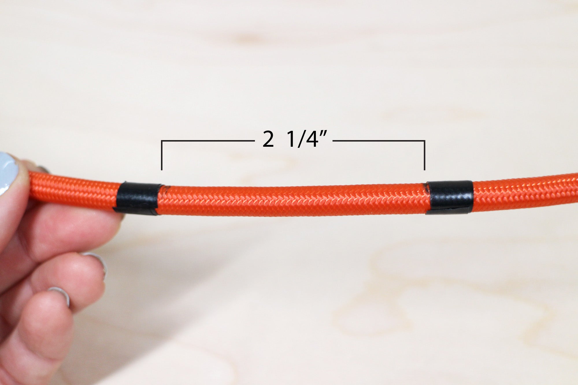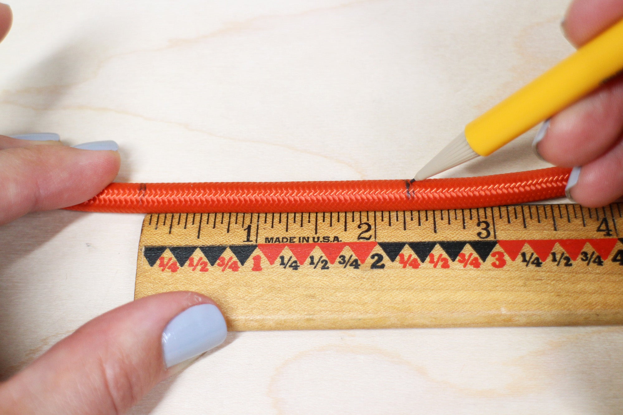 In the center of your 2' cord, measure 2 1/4" and mark with a pencil or pen.