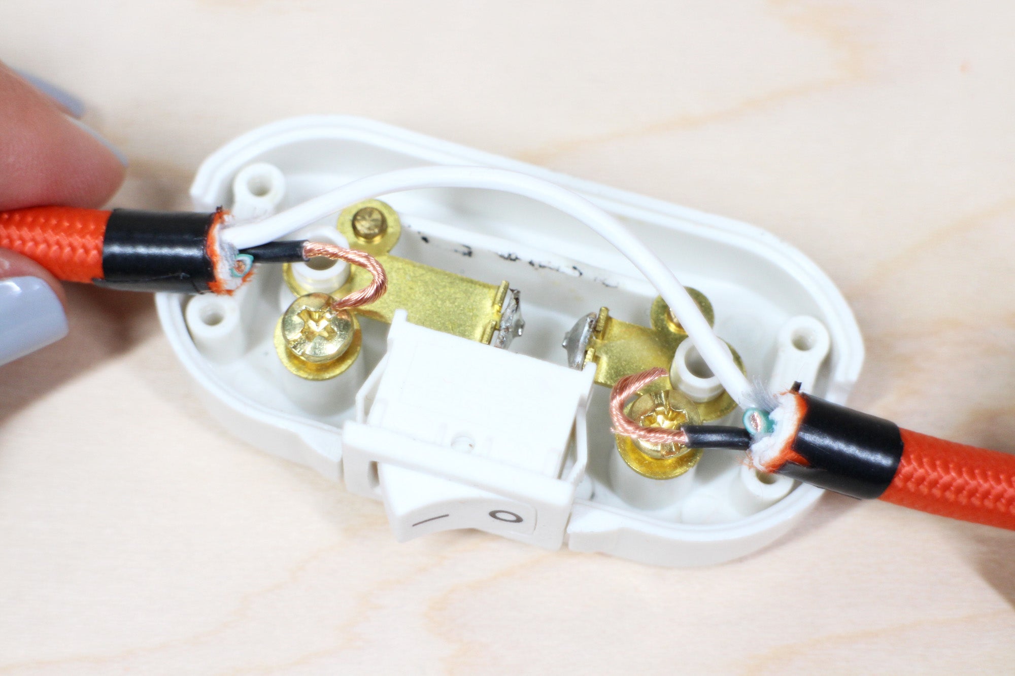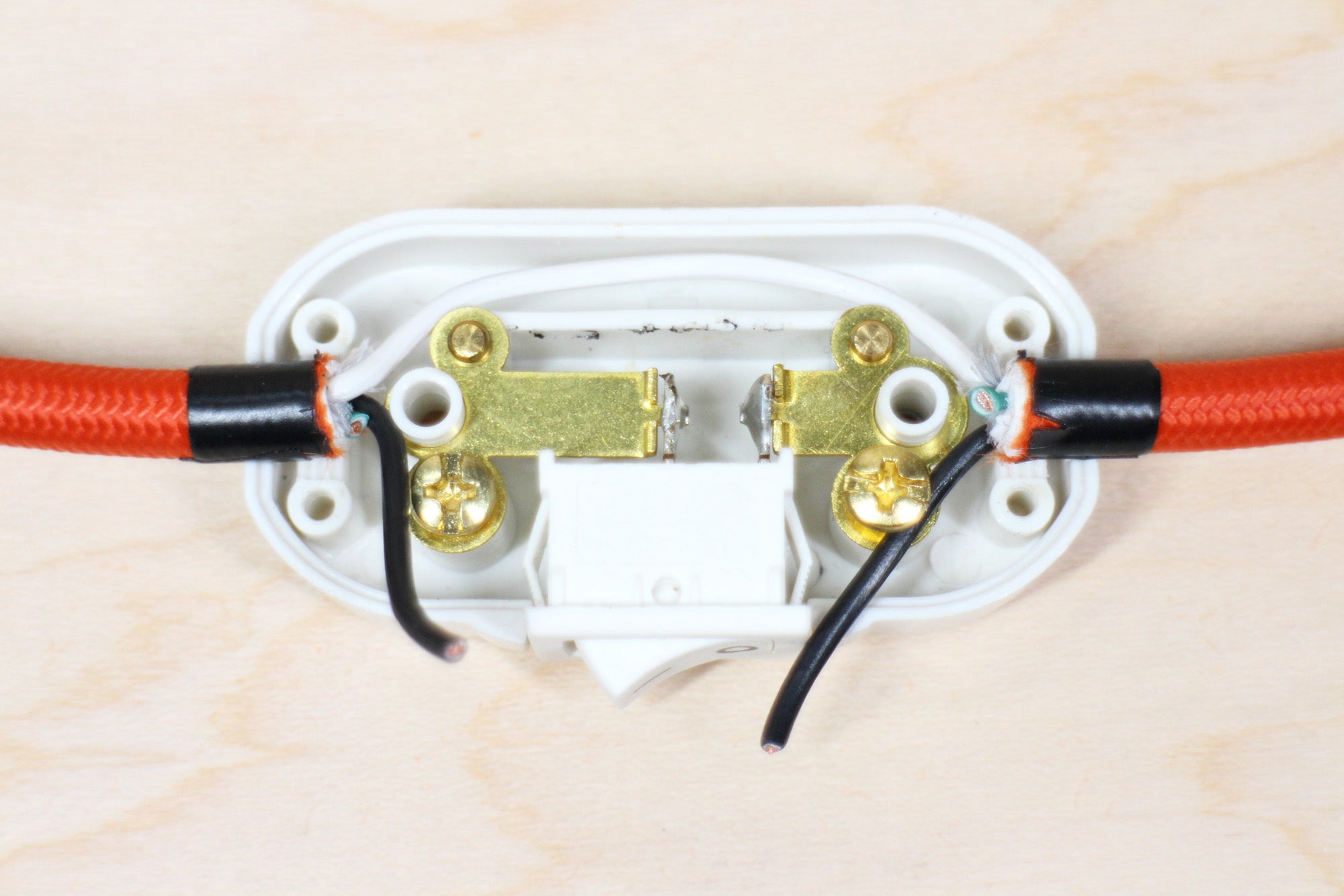Before wiring up the switch, gently remove the tape and use dabs of white glue to secure the cloth cover to keep it from fraying. Try to keep the glue as close to the cut end as possible, otherwise it will stick out from the switch and look messy. Let dry for a few minutes before proceeding.