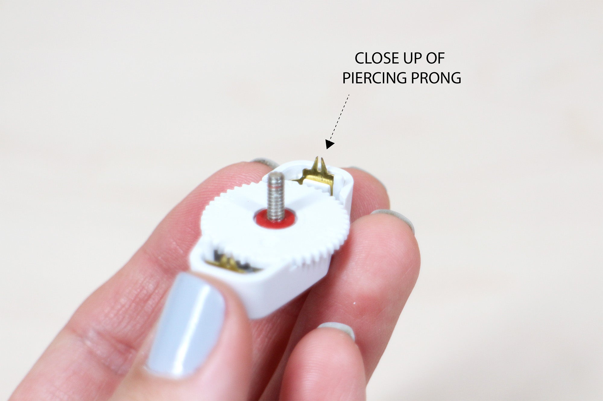 Take the rotary switch half and line up its pins and screw with their receptacles on the bottom half. Make sure the piercing prongs are lining up with the Hot wires and press it down until the edges of both halves touch.