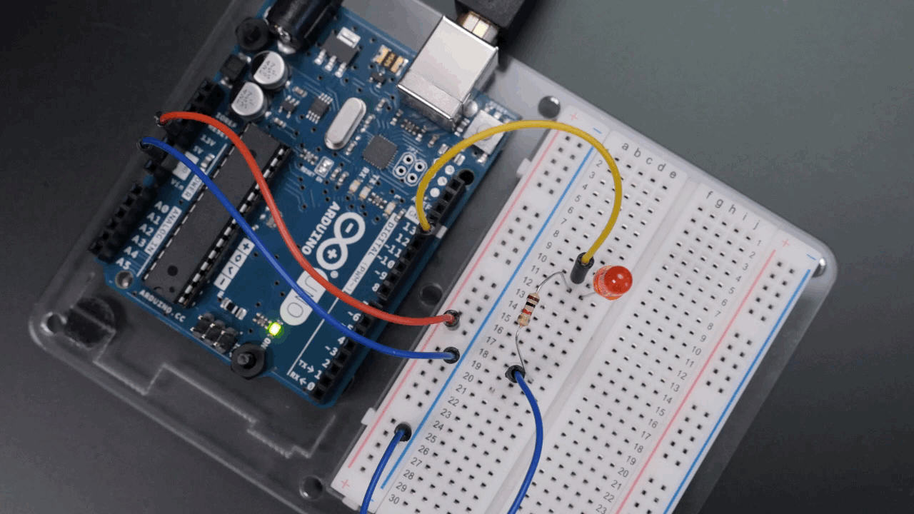 Plug in your USB cable and the LED should immediately start to blink! It's programmed to blink whatever's connected to pin 13. That includes the onboard LED you saw in your software setup as well as the one you just wired up.