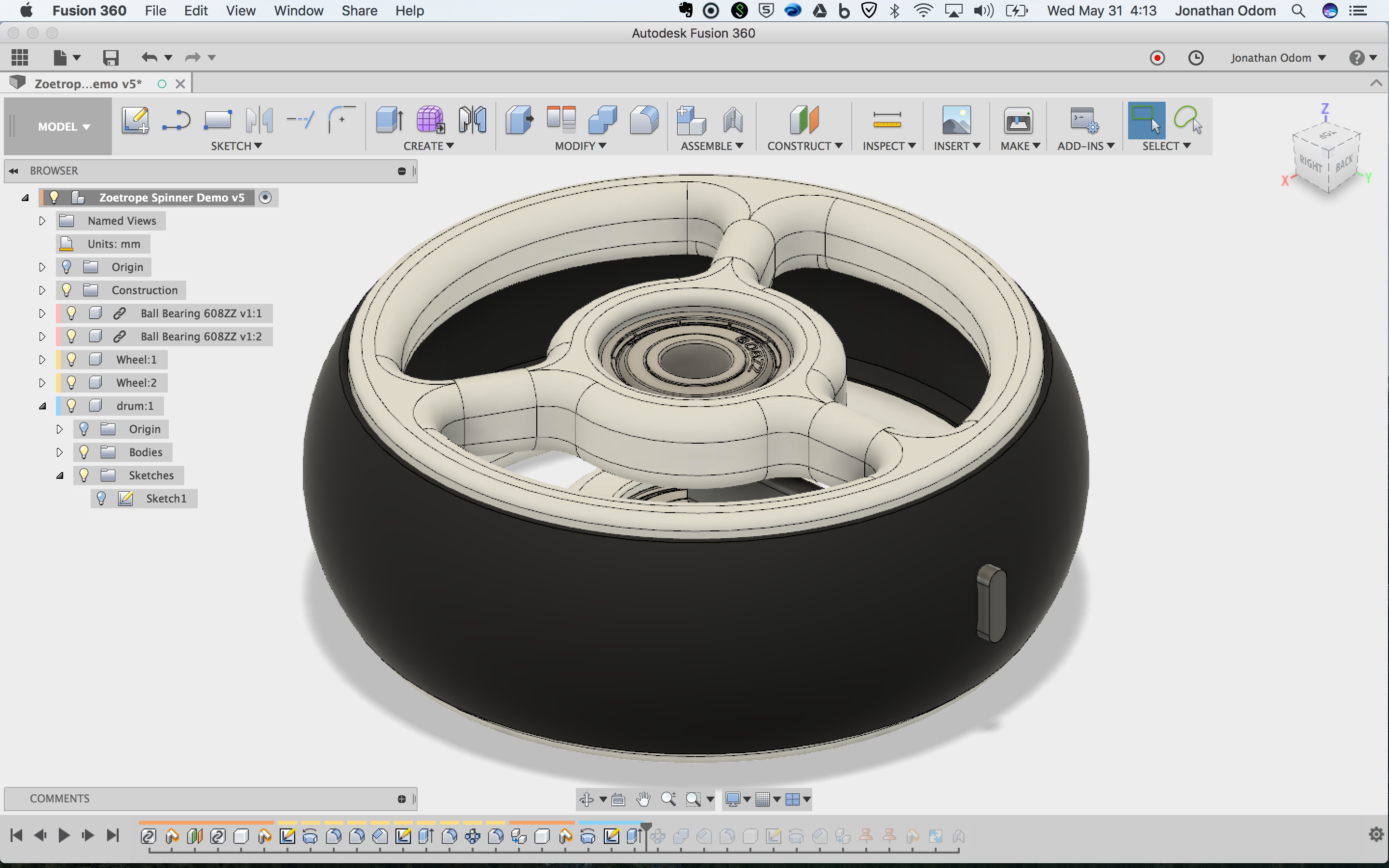 Believe it or not, this is actually a pretty simple 3D modeling project. All it is is a drum with 12 slots in it evenly spaced, two identical wheels on the top and bottom with holes cut out to let light in, and a couple of caps and bearings. The video above shows the process step-by-step, and I'll elaborate on it below.